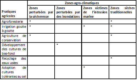 L’adaptation des systèmes de culture au changement climatique pour une gestion efficiente de l’eau doit ensuite se faire en fonction des zones agro-climatiques de production. A cet effet, on peut distinguer quatre zones agro-climatiques : les zones perturbées par la sécheresse, les zones perturbées par des inondations, les zones victimes de l’intrusion marine et les zones sèches traditionnelles. En réalité, il existe une diversité de pratiques qui peuvent être utilisées parmi lesquelles nous retenons principalement six : l’agroforesterie, l’irrigation goutte à goutte, l’agriculture de conservation, le développement des cultures de bas-fond, le recyclage des eaux usées et l’adoption de cultures tolérantes au sel. Le tableau 1 indique les pratiques agricoles jugées nécessaires en fonction des catégories de zones agro-climatiques.