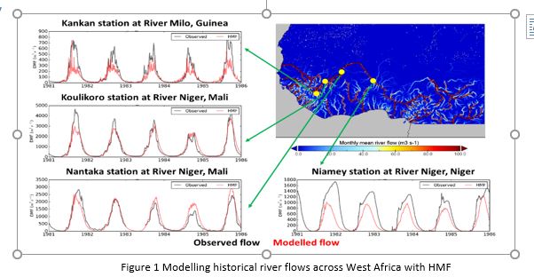 Les débits fluviaux estimés par le HMF sont spatialement cohérents dans l’ensemble de l’Afrique de l’Ouest et tiennent compte des projections de la population et de l’utilisation de l’eau, permettant de comprendre où et quand les populations sont particulièrement exposées aux inondations ou aux sécheresses. La situation des ressources en eau en Afrique de l’Ouest est assez complexe, avec plusieurs bassins hydrographiques internationaux et un nombre croissant de projets de développement tels que les grands réservoirs, les transferts entre les bassins et les captages.