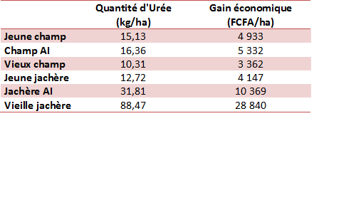 L’équivalent économique a été obtenu, en multipliant la quantité d’urée obtenue par 326 FCFA (coût d’un kg d’urée selon une société de commercialisation d’engrais au Burkina Faso).