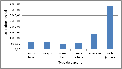 La Figure 2 montre que la production de déjection la plus élevée est obtenue dans les vieilles jachères (3 774,95 kg/ha), suivie de jachères d’âge intermédiaire (1 357, 20 kg/ha). La production de déjection dans les 3 types de champs et les jeunes jachères est inférieure 1 000 kg/ha avec la plus faible obtenue dans les vieux champs (440,12 kg/ha).