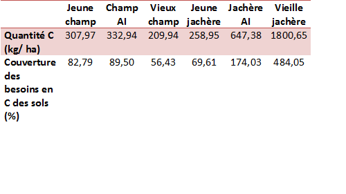 Tableau 1 : Quantité de C et couverture des besoins annuels en C des sols selon le type de parcelle