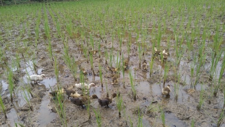 l’association agriculture-élevage (riz-canards), qui va permettre de lutter naturellement contre les herbes adventices, de valoriser les déjections animales pour augmenter la fertilité du sol, de désherber la parcelle, et d’améliorer simultanément la production agricole et des volailles.