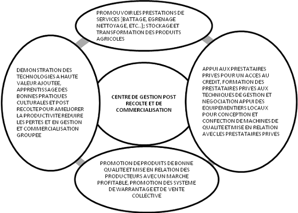 Ces Centres sont des structures physiques qui regroupent autour d’elles au moins 10 villages dont un village hôte et 09 villages satellites. Ils sont dotés d’un parc d’équipements de post-récolte et de transformation et offrent une opportunité d’affaires pour les producteurs et les femmes.