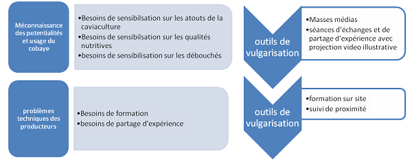 Sur plan local, les séances de vulgarisation combinent la projection des documentaires avec des commentaires, des données techniques (logement et fourrages), la distribution des dépliants contenant des messages simples et incitatifs, le recours à des manuels pratiques. La participation des producteurs au processus de vulgarisation en tant que vulgarisateurs est cruciale. A l’exemple de Jeremie Votio, caviaculteur et restaurateur de Batcham à l’Ouest Cameroun, des vulgarisateurs bénévoles participent activement à une large sensibilisation en partageant leur expérience dans le secteur caviacole et en promouvant localement des pratiques tirées de leurs savoirs.